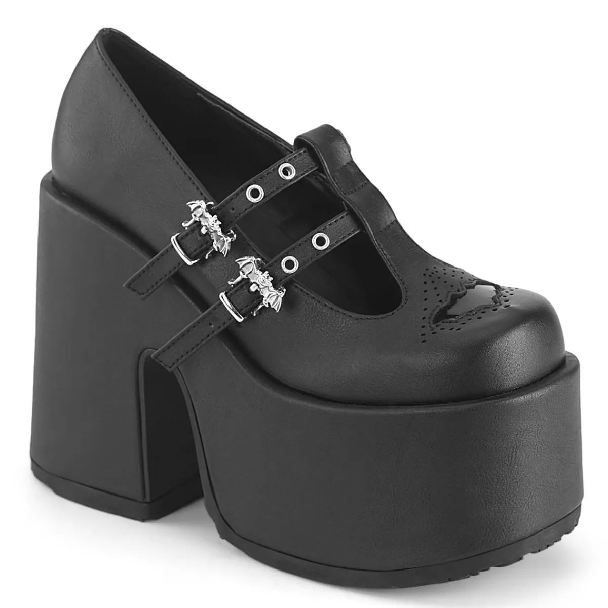 5″ (127Mm) Chunky Heel, 3″ (76Mm) Platform Double T-Strap Maryjane Featuring Silver-Tone Bat Buckles & Bat Cutout On Vamp