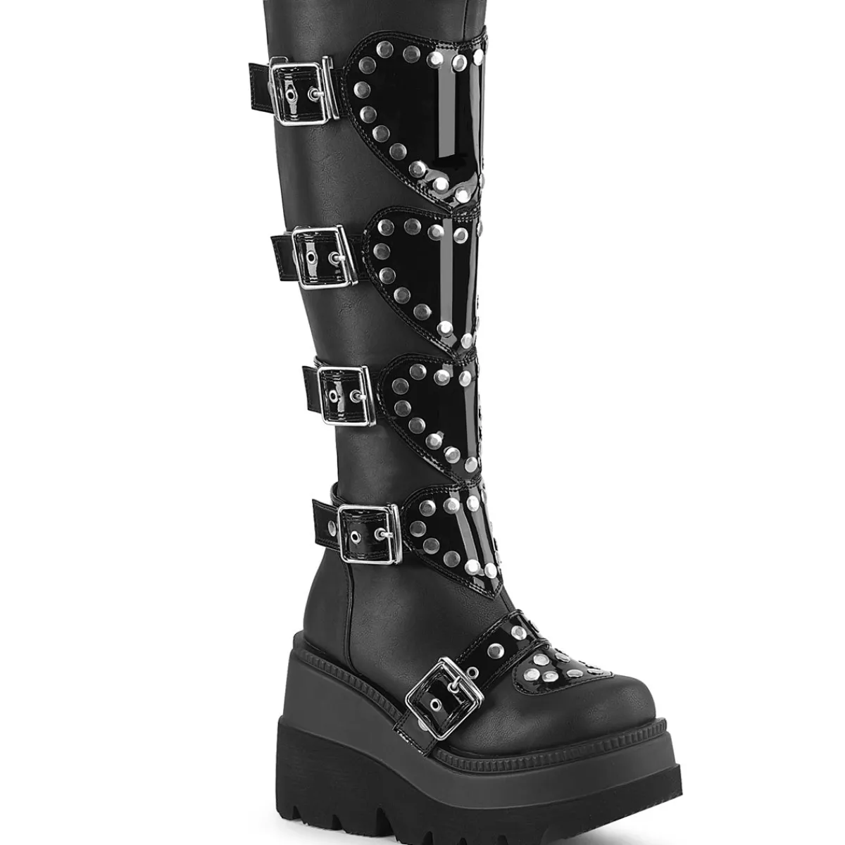 4 1/2″ (114Mm) Wedge Platform Platform Knee High Boot Featuring Buckled Heart Shield Center W/Round Studded Details, Metal Inner Side Zipper