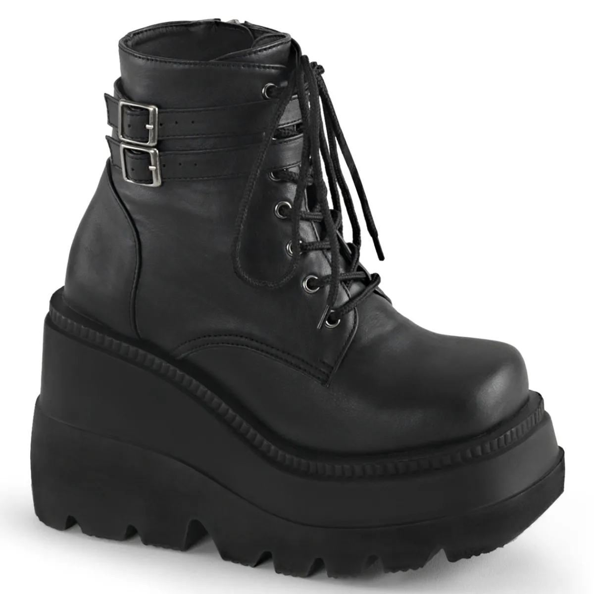 Shaker-52 Is The Quintissential Demonia Ankle Boot. Featuring A Daring 4.5″ Stacked Wedge Platform That Will Elevate Any Outfit From Ordinary To Extraordinary. The Striking Black Vegan Leather Adds An Edgy Touch To Your Look, While The Lace-Up Front And Double Buckled Ankle Straps Provide A Secure And Comfortable Fit. The Full Inner Side Zip Closure Ensures Ease Of Wear, While The Iconic Design Will Have Heads Turning With Every Step. Whether You’Re Hitting The Club Or Dressing Up For A Special Occasion, The Shaker-52 Is The Perfect Choice For Anyone Looking To Make A Bold Statement With Their Footwear. Get Ready To Stomp And Shine In These Unforgettable And Versatile Boots.